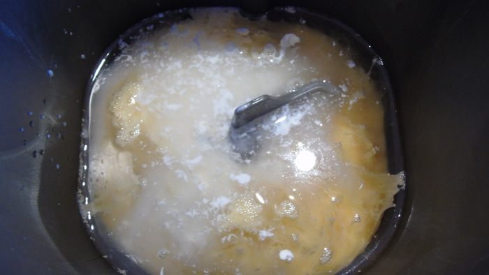 В хлебопечку вливаем воду, яйца и сливки жирные или же можете их заменить сметаной.