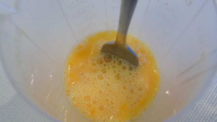 Итак, начнем. Яйца слегка взбиваем вилкой.