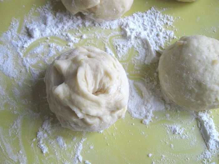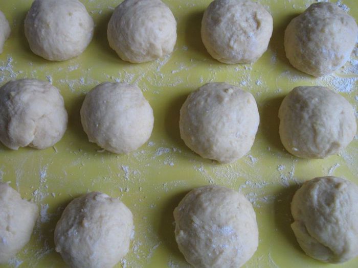 Рабочую поверхность присыпать мукой. Тесто разделить на кусочки (весом 70 граммов каждый), скатать шарики, оставить на 15 минут.