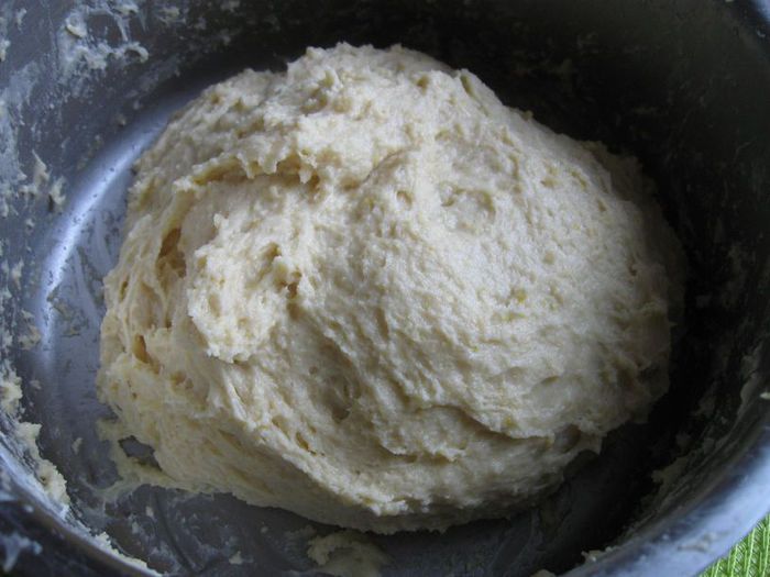 Вымесить тесто с помощью насадки крюк. Оставить на 90 минут в кастрюле под полотенцем для подъема.