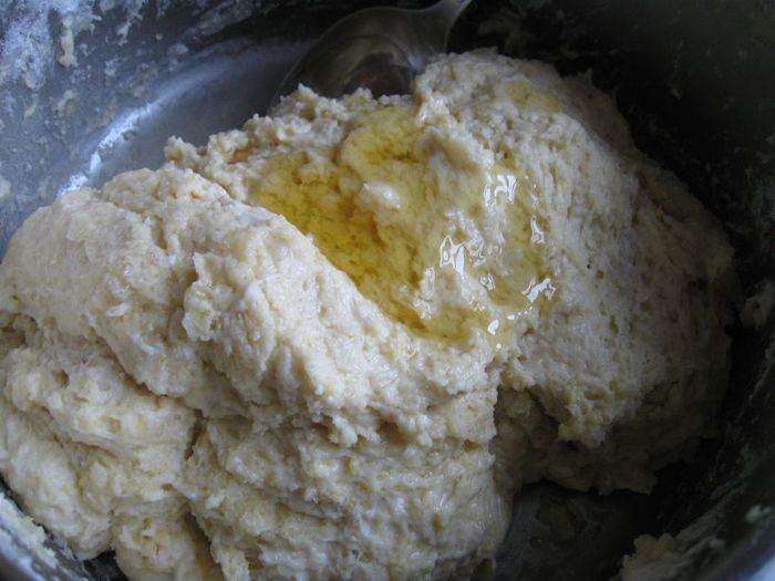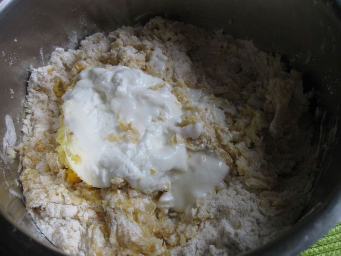 Соединить яйца, желток, половину сахара, растопленное масло, опару и столько муки, сколько необходимо для вымешивания. Добавить йогурт в три приема вместе с оставшимся сахаром и мукой (постепенно).