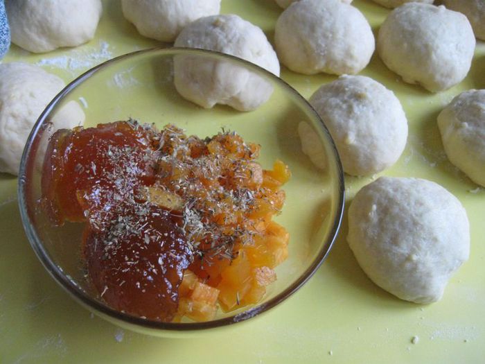 Опционно. Часть булочек сделала с начинкой (50 г тыквы, запеченной с небольшим количеством меда, 1,3 ч. л. абрикосового джема, 1 щепотка сухого орегано и 1 щепотка сухого тимьяна).