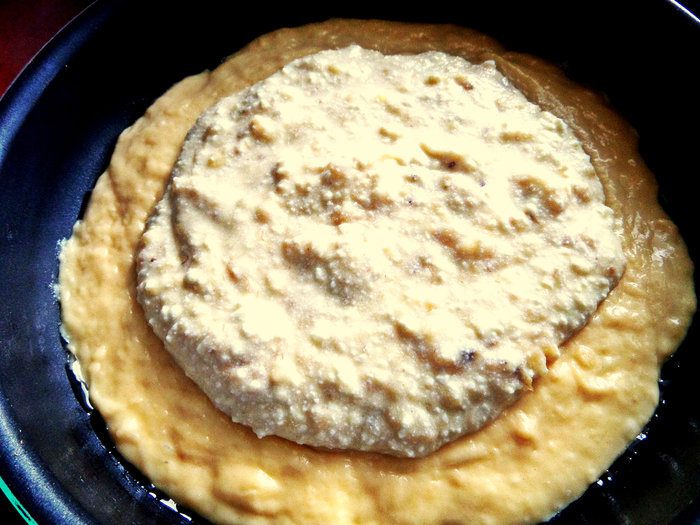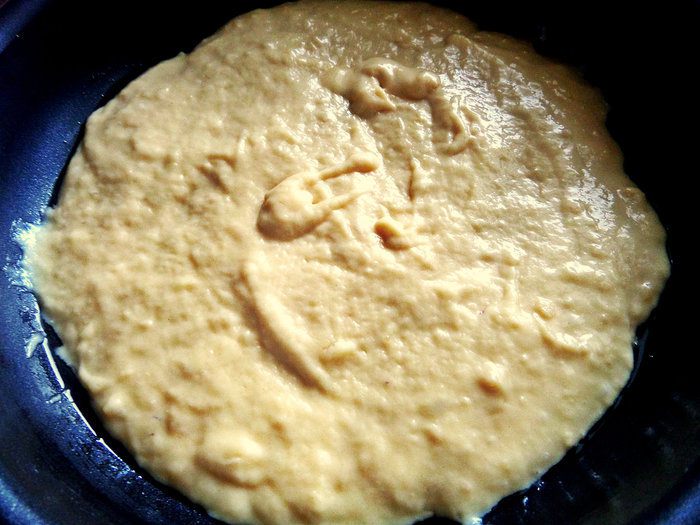 Даем тесту минут 5 постоять и затем распределяем по дну смазанной тефлоновой формы. Моя форма 22 см в диаметре.