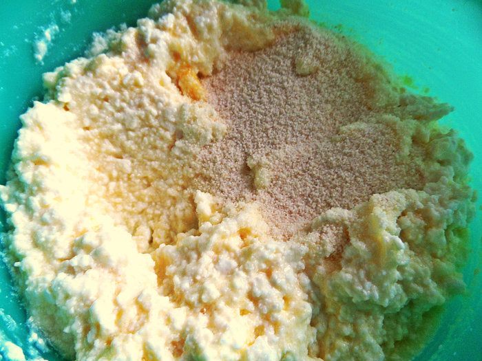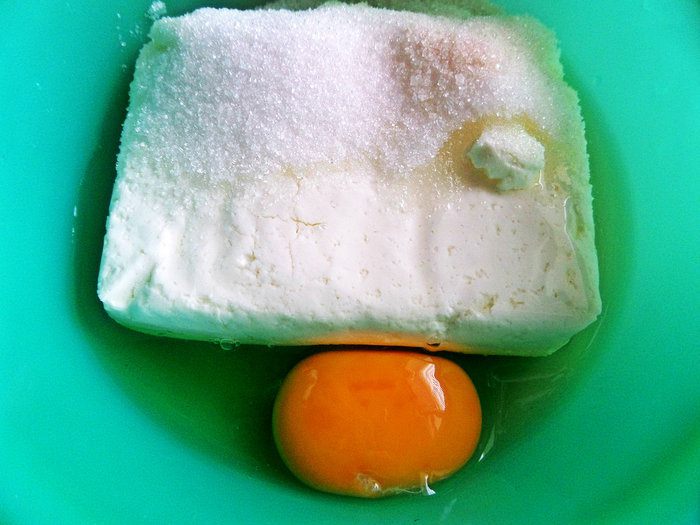 Для начинки вбиваем в пачку творога пару яиц или одно крупное. Ваниль и сахар по вкусу.