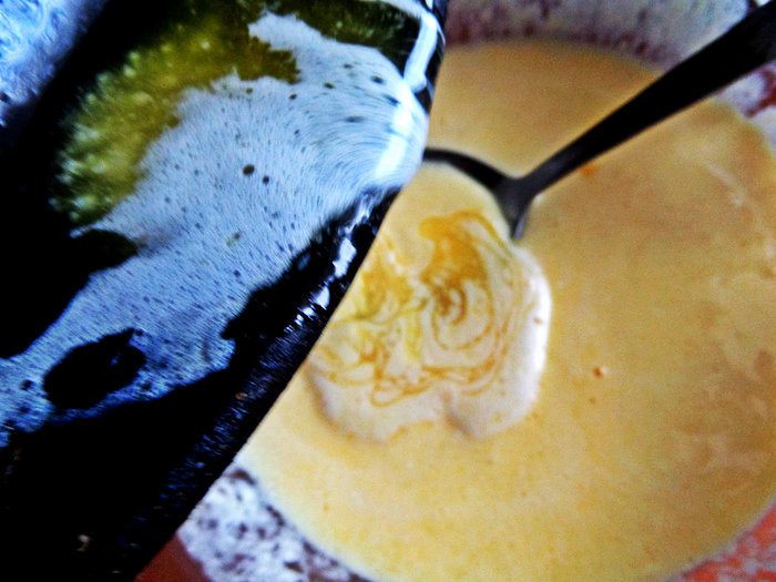 Масло растопить и влить, когда оно слегка остынет, в тесто.
