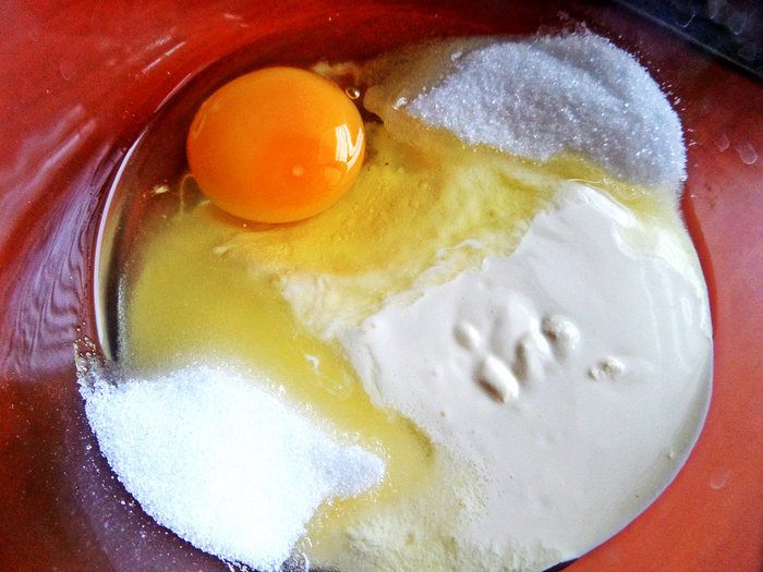 Для жидкой основы смешиваем сметану, яйцо, муку "Аладушкин" с разрыхлителем, сахар.