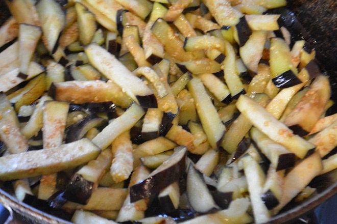 Баклажаны помыть, обсушить и нарезать соломкой. Обжарить на 2 ст. л растительного масла до небольшого подрумянивания и мягкости.