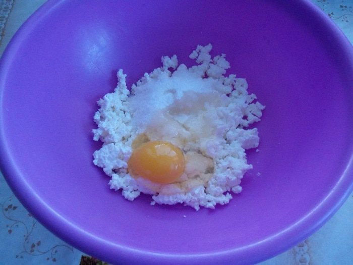 В чашку выкладываем творог «Домик в деревне». Хорошо разминаем вилкой. Добавляем щепотку соли, сахар и взбитое яйцо. Хорошо перемешиваем.