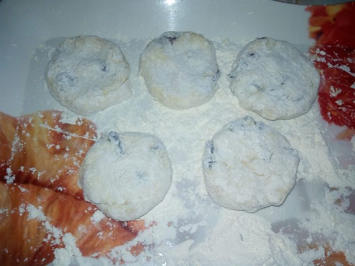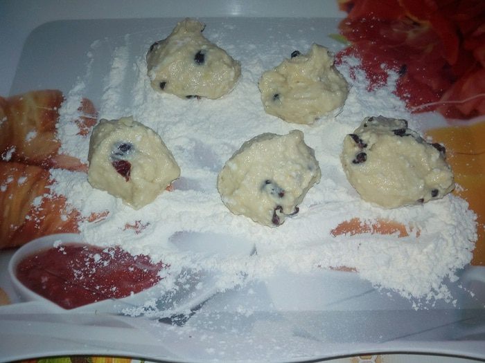 На разнос, припудренный мукой, выкладываем небольшие порции теста. Обваливаем в муке.
