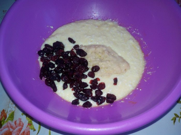 В чашку к творожной массе добавляем банановое пюре и вяленую клюкву. Хорошо перемешиваем.