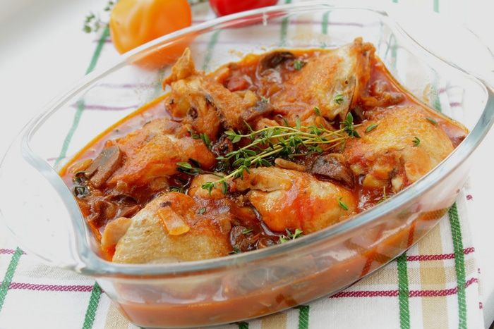 Переложить в форму для запекания, готовить под крышкой 35 минут при 180 градусах. Добавить тимьян и запекать еще 10 минут.
