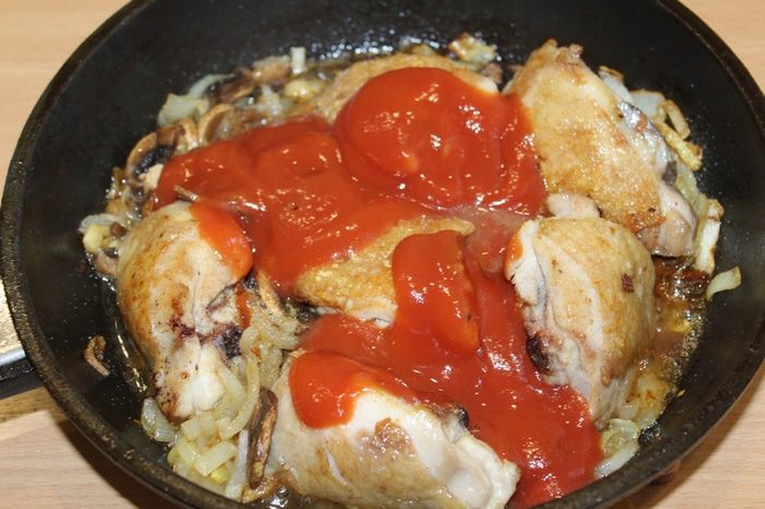 Добавить помидоры, влить куриного бульона (или воды) около стакана, посолить, поперчить.