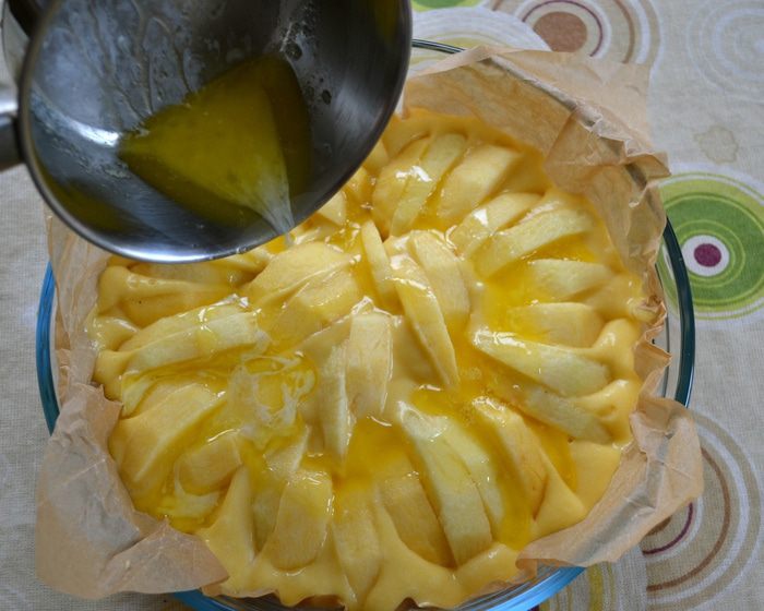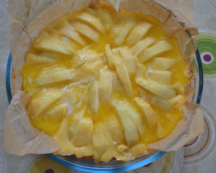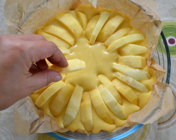 В тесто выложить дольки яблок вертикально, утапливая их немного в тесте. В произвольном порядке, но чем больше яблок у вас пойдет в пирог, тем вкуснее! :)