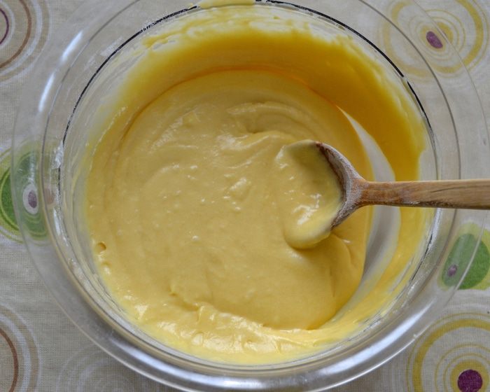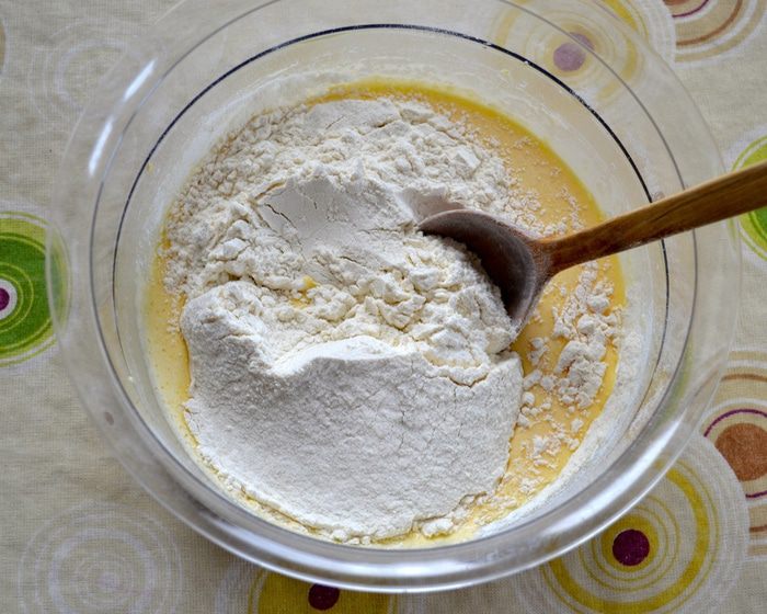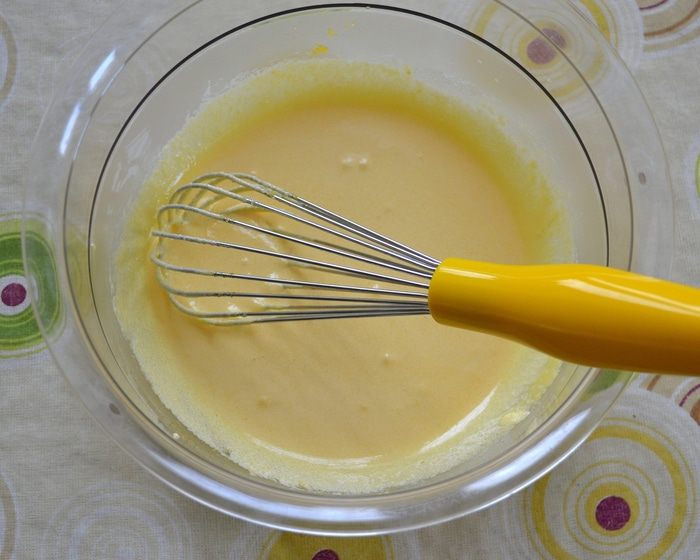 Растопить сливочное масло. Влить половину масла в яичную массу, добавить молоко, щепотку соли, просеянные муку и разрыхлитель. Все перемешать.
