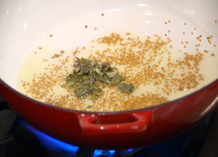 Разогреть в глубокой тяжелой сковороде 1 ст. ложку оливкового масла, всыпать листья карри и семена горчицы и, помешивая, прогреть.