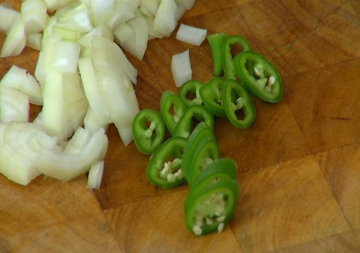 Перец чили вместе с семенами порезать колечками.