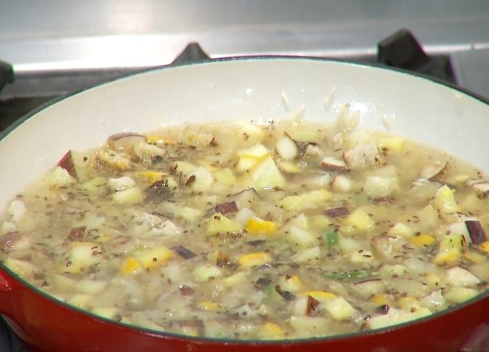 Цукини нарезать маленькими кубиками, добавить в сковороду, влить еще немного оливкового масла и перемешать.