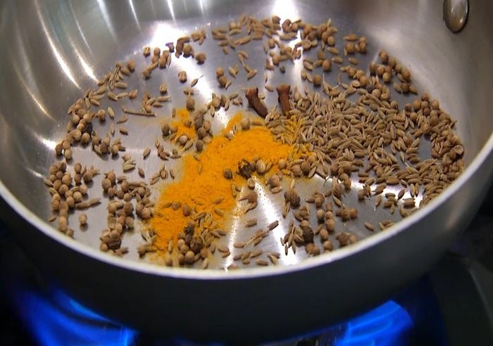 Гвоздику, черный перец, кориандр, зиру и куркуму прогреть на сухой разогретой сковороде, затем пересыпать в другую посуду и остудить.