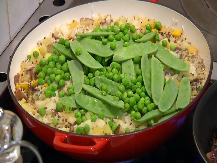 Добавить зеленый горошек и стручки молодого горошка, все перемешать, если необходимо, влить немного горячей воды и продолжить прогревать под крышкой еще около 5 минут, до готовности риса.