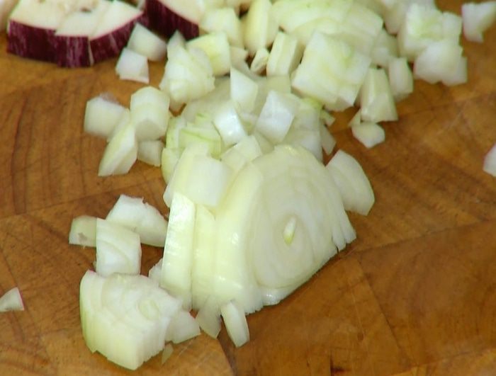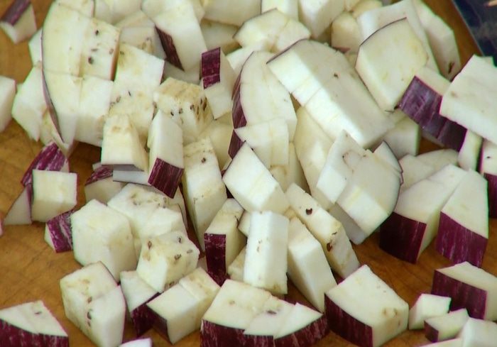 Баклажан нарезать маленьким кубиками.