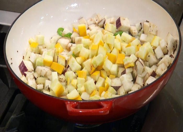 Баклажан, лук и перец чили добавить в сковороду с карри и горчицей, все перемешать.