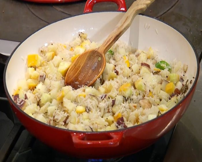 Измельченными специями посыпать рис с овощами, все перемешать и залить горячей водой, так чтобы рис был покрыт жидкостью. Накрыть сковороду крышкой и на медленном огне томить 15 минут.