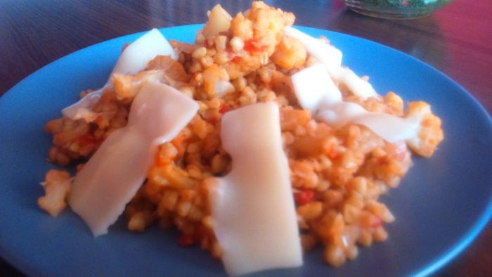 Пол стакана гречки (я брала необжаренную) залить пол стаканом воды, проварить до полу готовности. Добавить очищенные мелко покрошенные помидоры и смесь с цветной капустой. Проварить до готовности гречки.