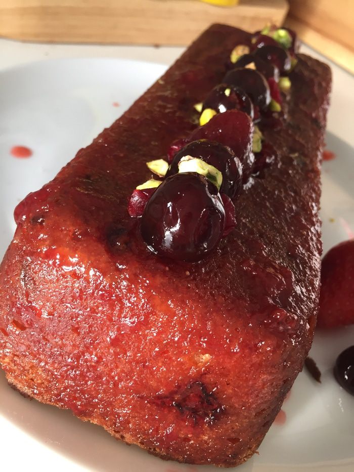 С кекса срезаем неровную верхушку и переворачиваем срезом на тарелку. Обильно поливаем сиропом, распределяем его и по боковым поверхностям кекса. Украшаем вишенками-клубничками-клюквой, я еще фисташками немного. И вот, быстрый, легкий, но очень вкусный кекс готов!!!
