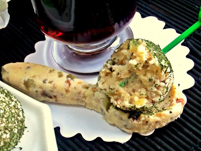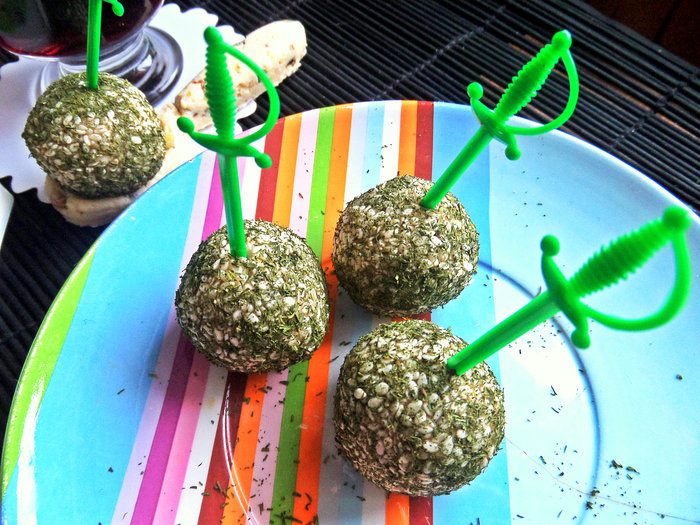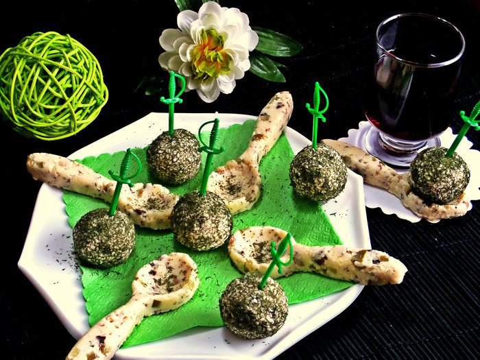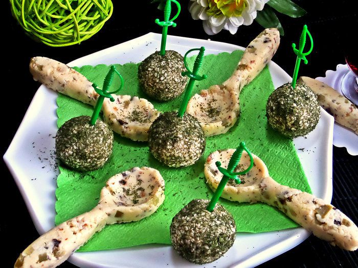 Вот так прямо подаем. Можно на сырную "ложечку" положить маслинку. А шарики подать в тарталетках из несладкого теста.