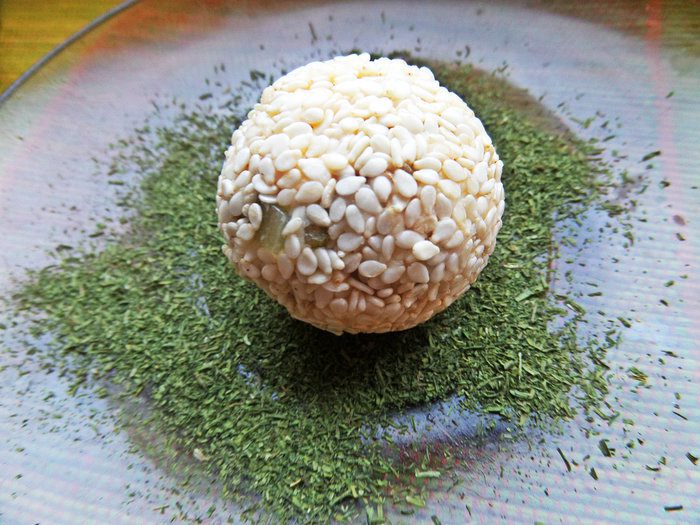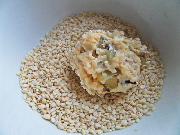 Для подачи берем кусочек сырной массы и катаем шарик в семечках.