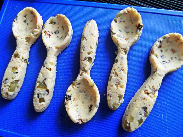 Заполняем плотно ячейки ложек сырной массой, выравниваем. Убираем в холодильник до застывания.
