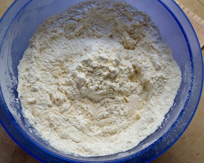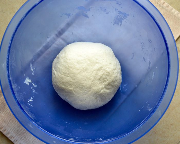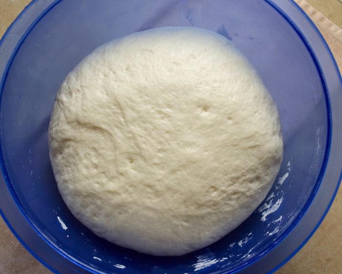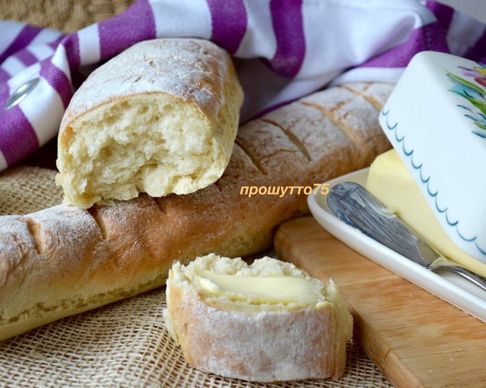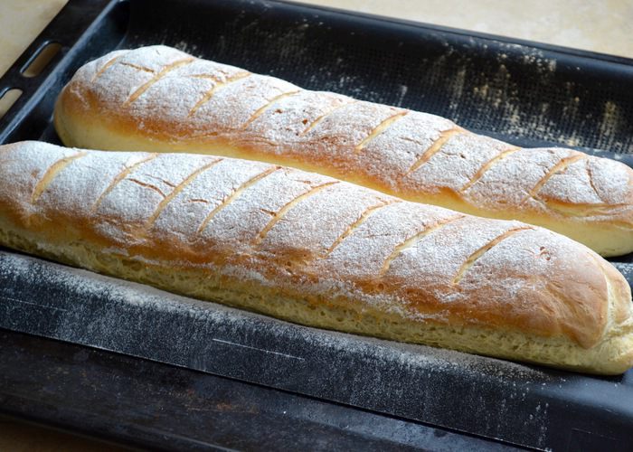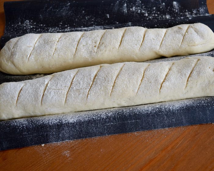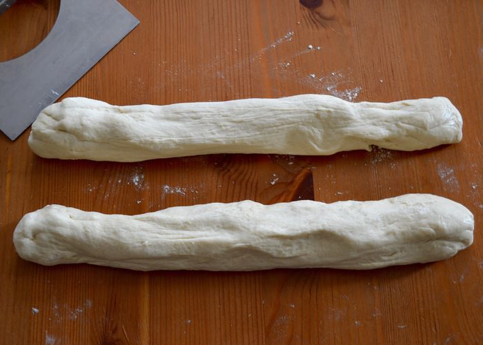 Выложить воздушное и очень податливое тесто на рабочую поверхность, слегка присыпанную мукой, и разделить на две части, смазав руки оставшимся маслом. И опять облегчаем себе процесс приготовления багетов, т. к. мы не будем раскатывать и скручивать багеты, а просто растянем каждый кусочек теста в длину — быстро и просто. Выложить багеты на противень, застеленный пекарской бумагой и присыпать слегка мукой. Накрыть полотенцем и дать отдохнуть еще буквально 15 минут.