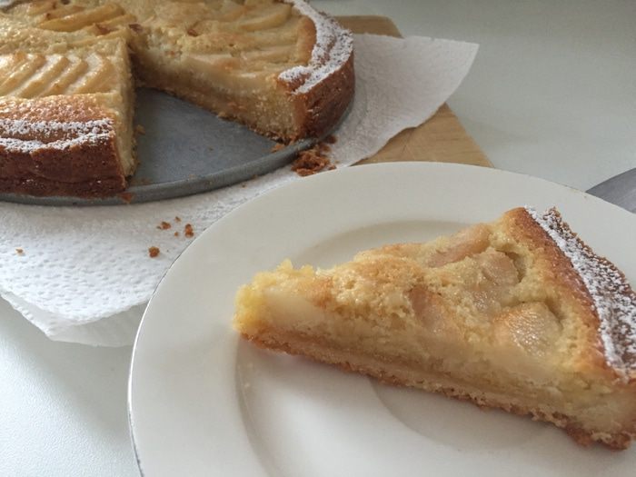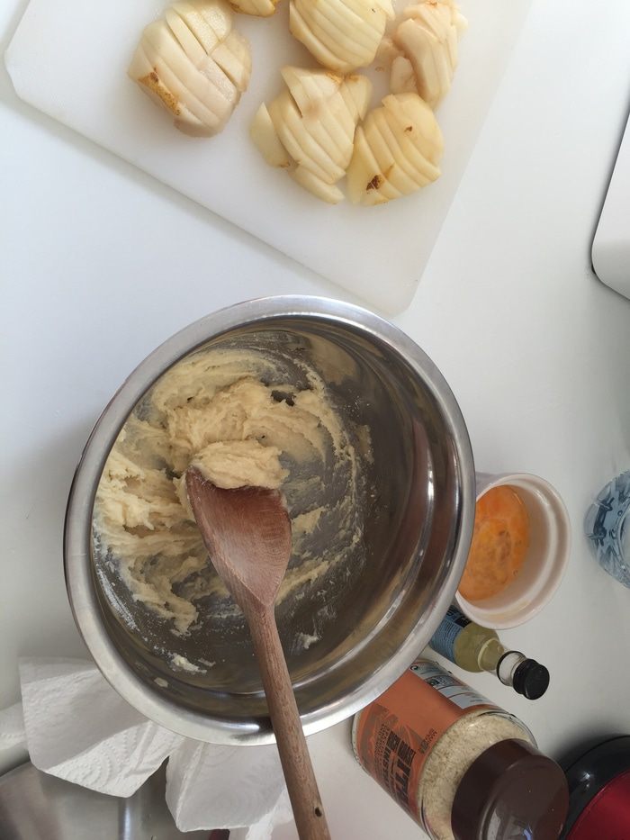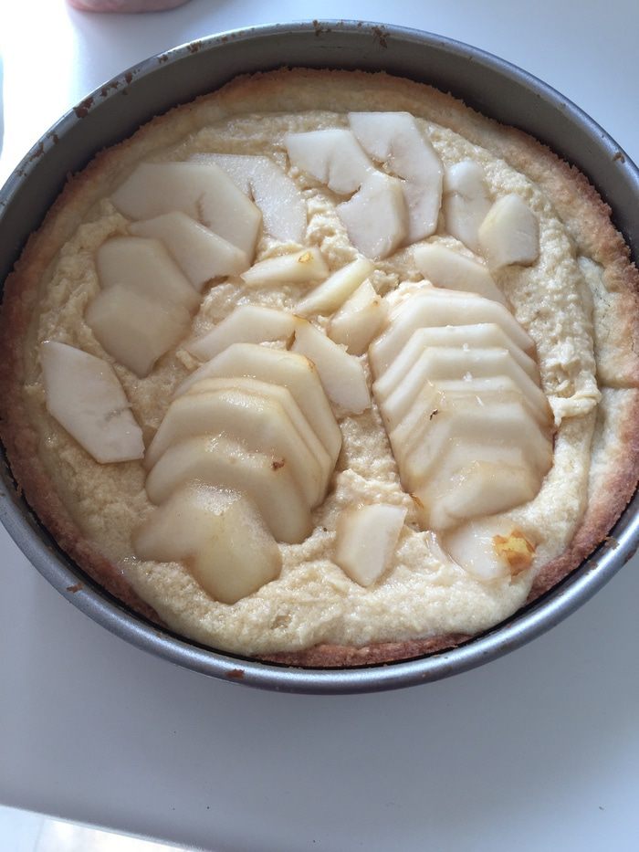 Потом вводим оба вида муки и еще раз хорошо вымешиваем. Крем выкладываем на остывшую основу. Сверху укладываем почищенные и порезанные груши. (Делали с дочей, поэтому выкладка разная;)