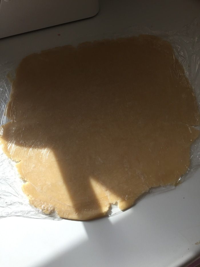 Когда тесто отдохнет, оно более податливое. Разогреваем духовку до 200°C. Разворачиваем тесто, накрываем вторым слоем пленки и раскатываем до 3-4 мм приблизительно.