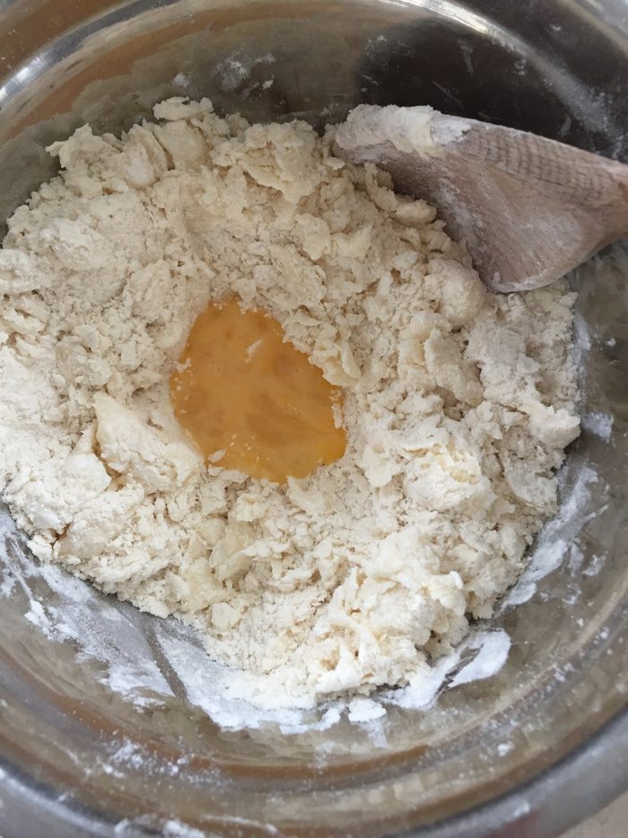 Потом постепенно добавляем пол-яйца (разбиваем в миску, немного взбалтываем, выливаем половину в тесто).