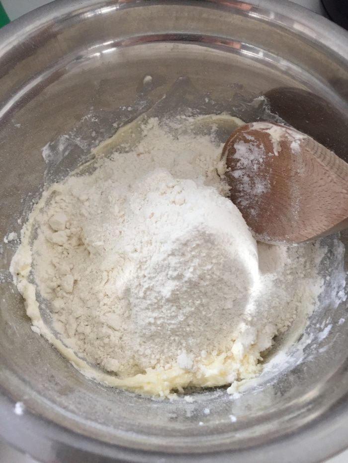 Потом добавляем просеянную муку и соль. Растираем дальше.