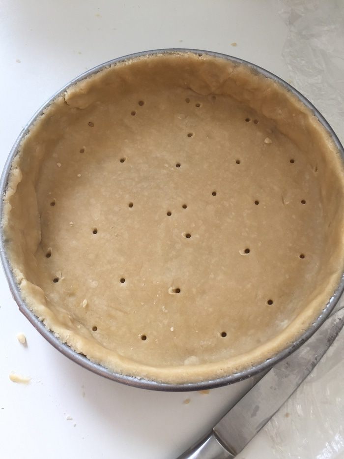 Переносим тесто в форму, утрамбовываем, отрезаем лишнее. У меня форма 20 см, остается еще тесто на шесть печенюшек. Тесто прокалываем палочкой и отправляем на минут 15 в духовку. Достаем, даем остыть.