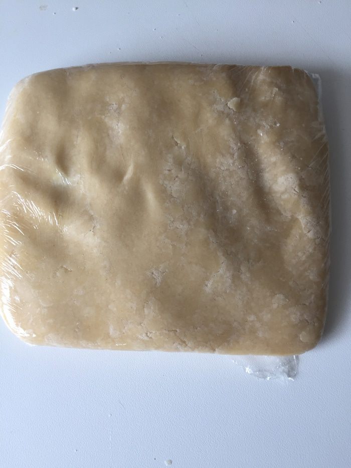 Пробуем собрать тесто, на самом деле оно еще может пока не собраться. Тем не менее я "высыпаю" тесто на пищевую пленку, заворачиваю, утрамбовываю и отправляю в холодильник мин на 1 час.