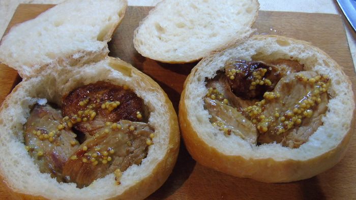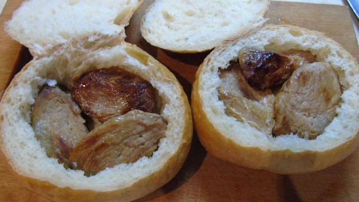 В булочке удаляем мякиш и выкладываем наше мясо.