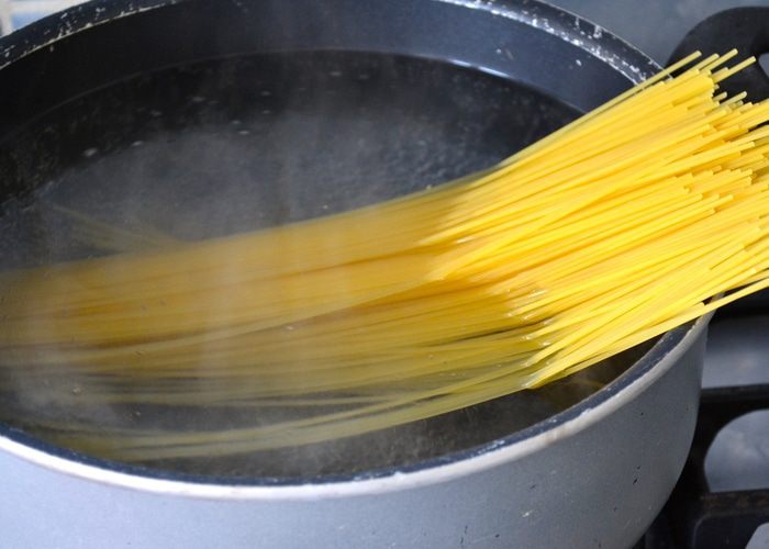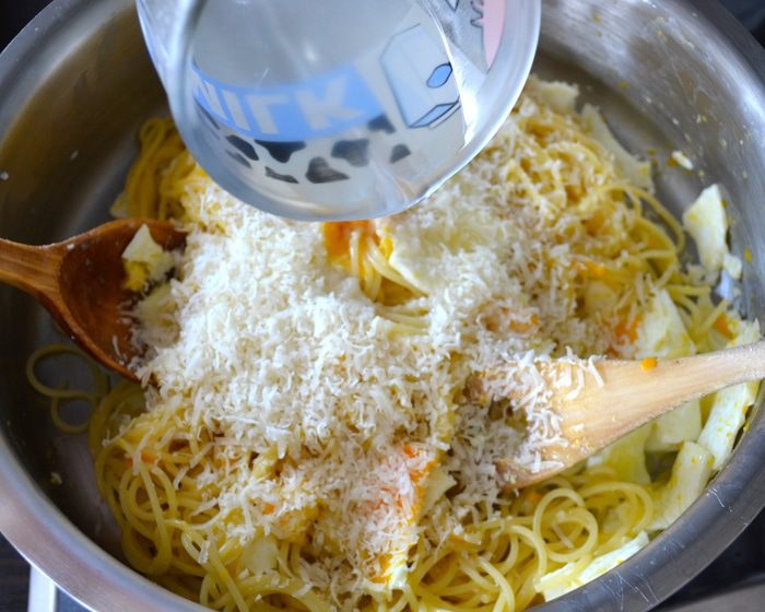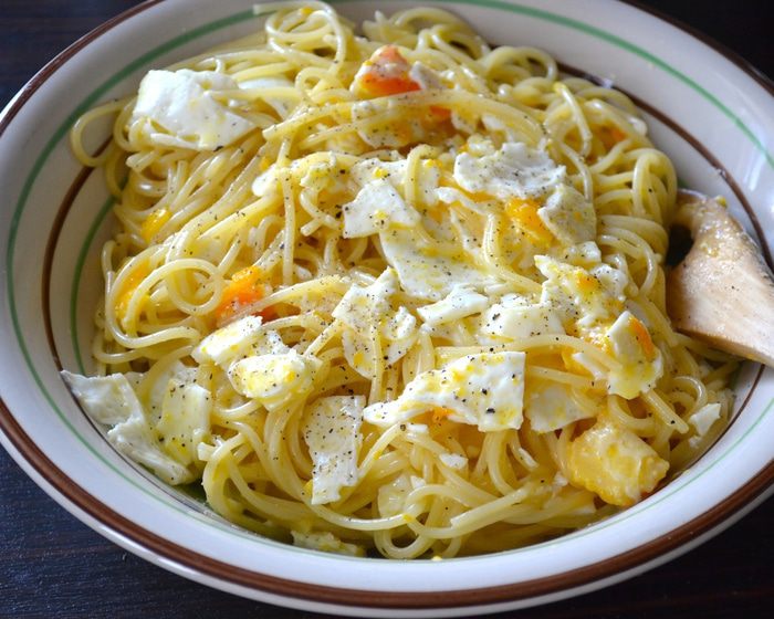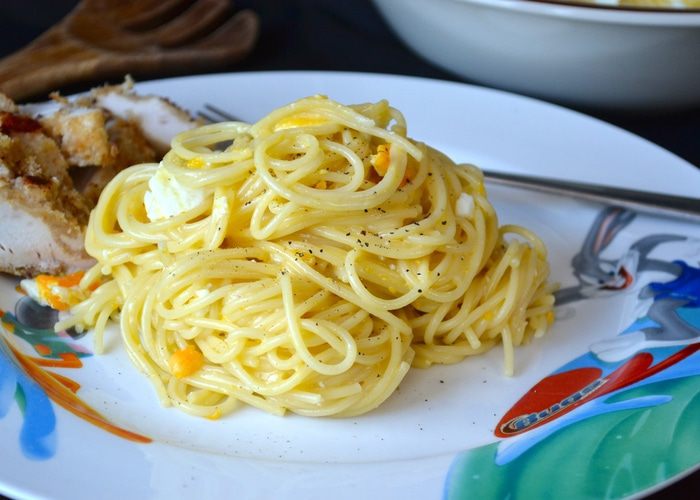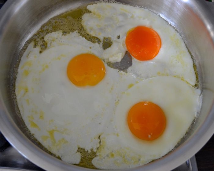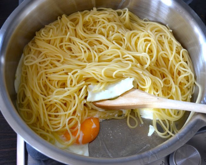 Как только положили в кастрюлю вариться спагетти, ставим на огонь сковороду. Она должна быть достаточно большой, чтобы потом в нее же поместились спагетти. Добавляем оба вида масла и разбиваем яйца, как на яичницу. Жарим буквально 1.5 минуты - белок должен "схватиться", но желток не должен зажариться! Это важно, не "пересушить"! Посолить яйца и снять с огня сковороду.