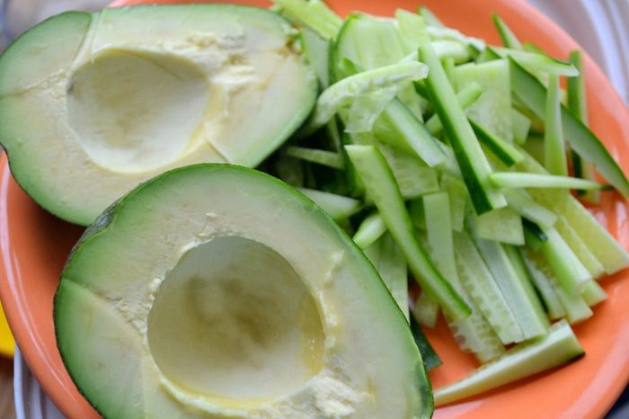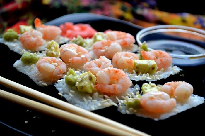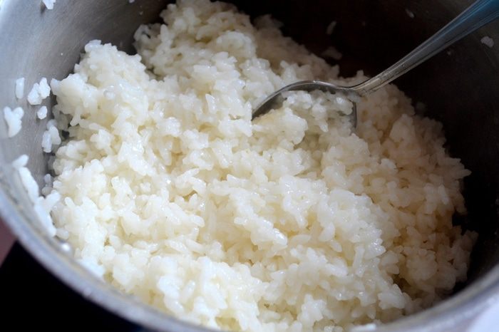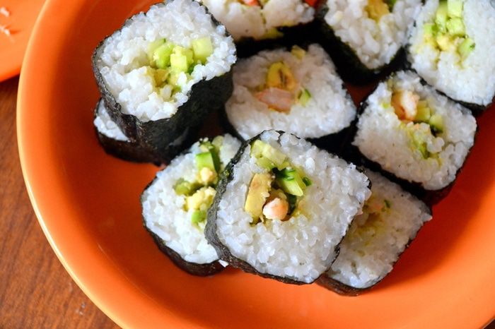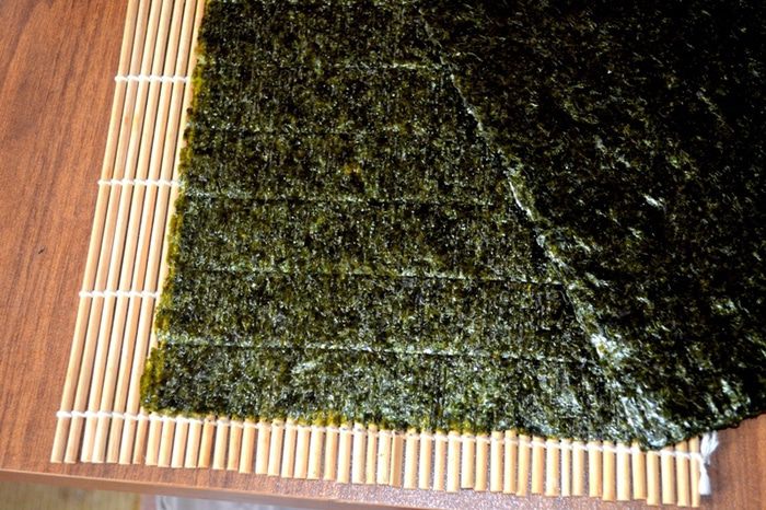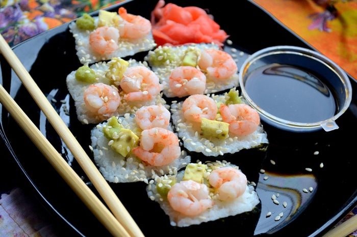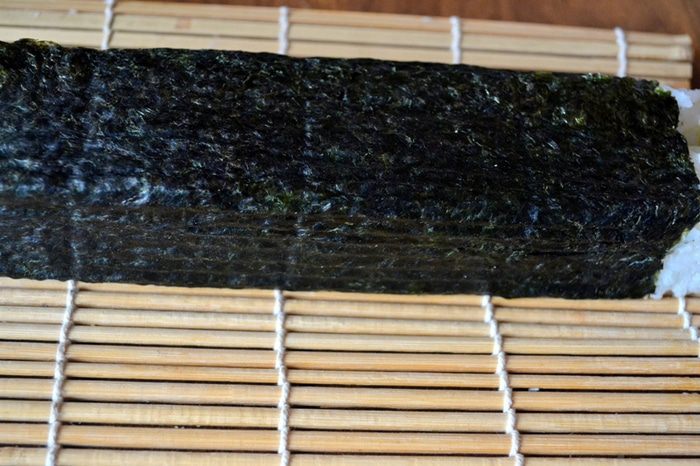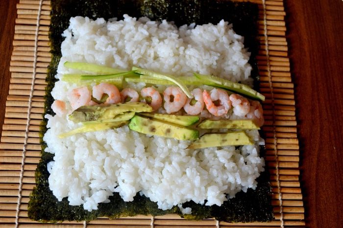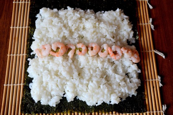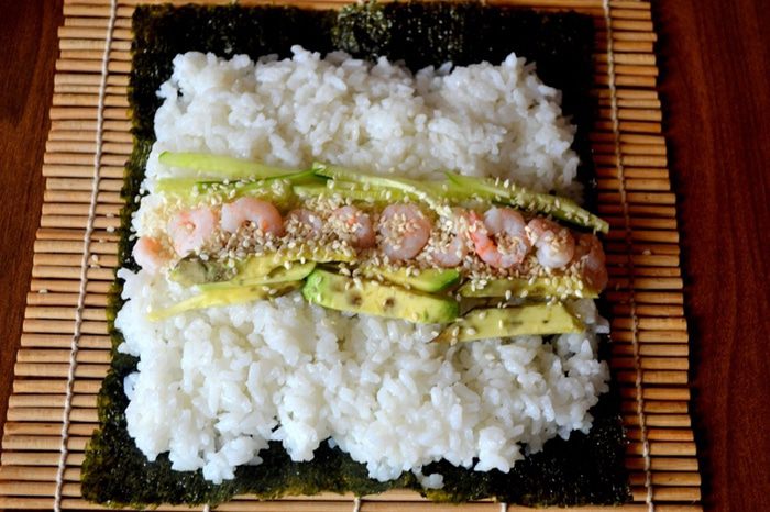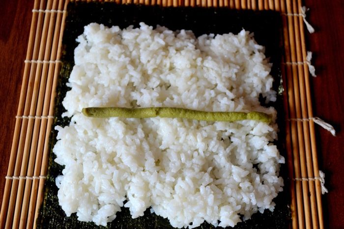 2. Начинка должна оказаться внутри - мы ее "укутываем" слоем риса и нори