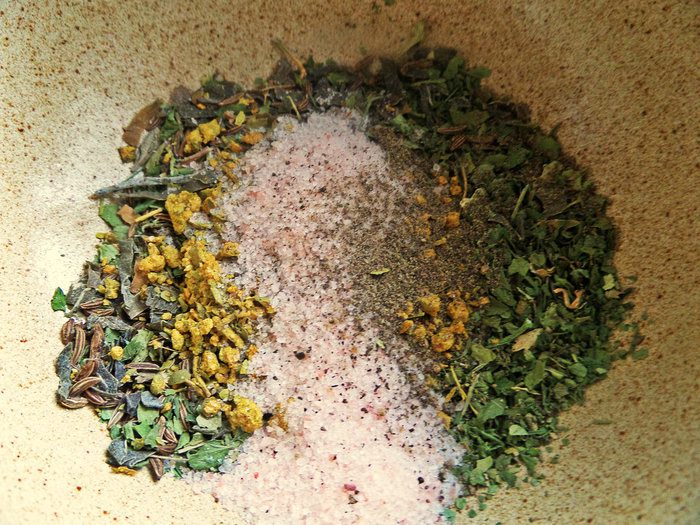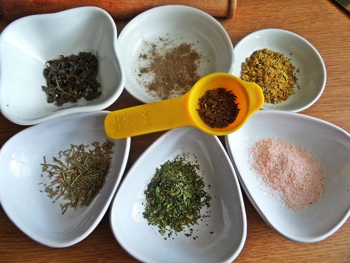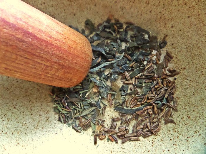 Готовим специи. Тмин, тимьян, морскую капусту растолочь в ступке.