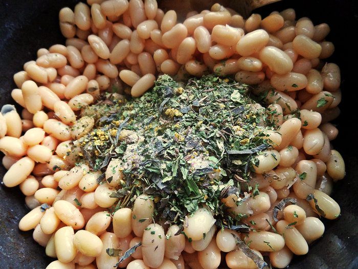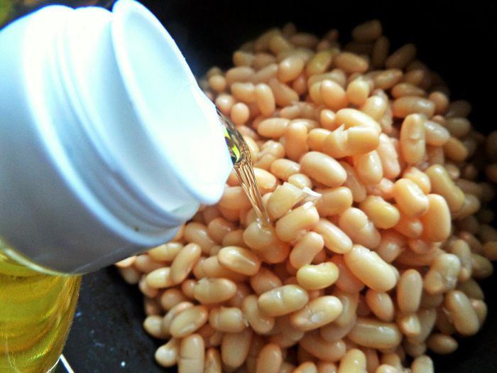 Фасоль замочить, отварить заранее. Я взяла белую мелкую. Варить не до сильной разваристости, как в супе.