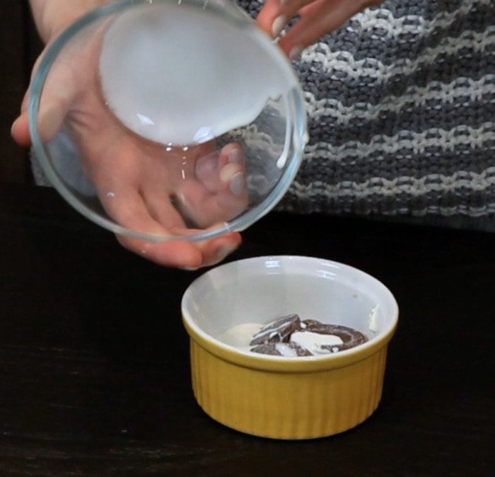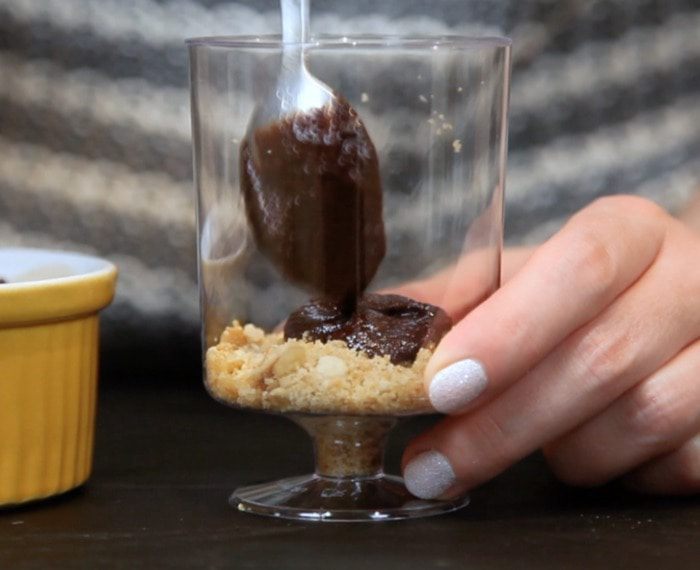 Затем выложить шоколадный соус в формочки поверх печенья.