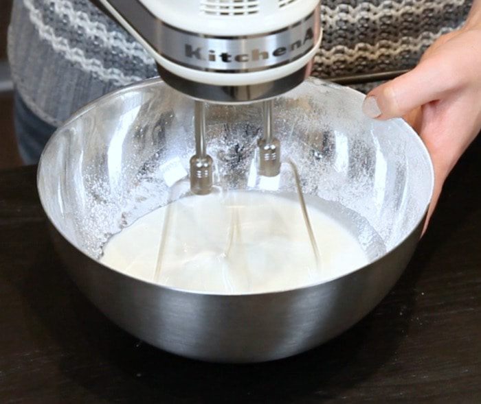 Отдельно взбить 250 мл жирных сливок до плотных пик.