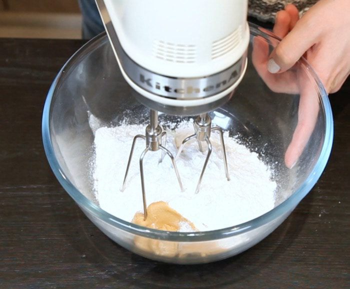 Взбить до однородности сыр с арахисовой пастой и сахарной пудрой.