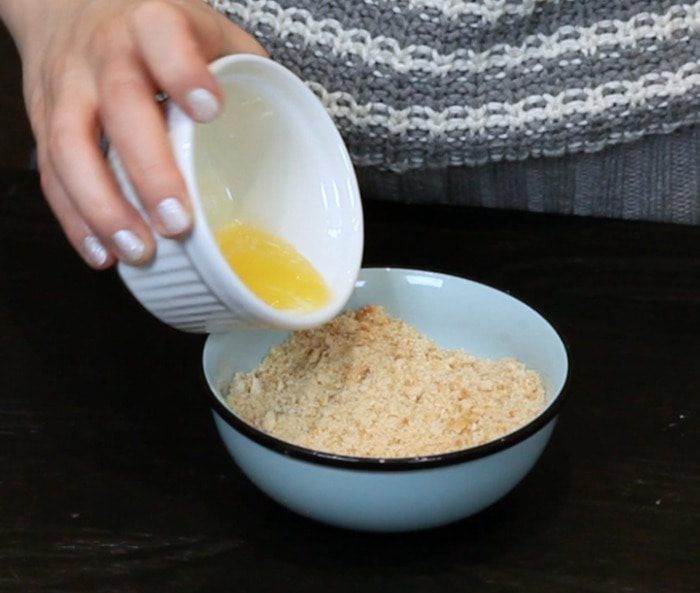 Смолоть печенье в крошку и перемешать с растопленным сливочным маслом.