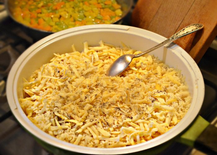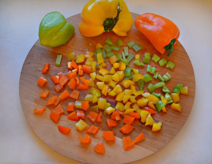 Половинки разноцветного болгарского перца помыть, освободить от семян и перегородок, нарезать небольшими кубиками. Разогреть в сковороде растительное масло, слегка обжарить чеснок и затем вынуть. В полученном чесночном масле обжарить перец в течение 3-5 минут.
