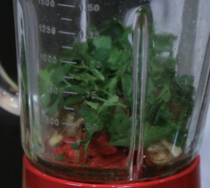 Запечь овощи на мангале или в духовке. Если выберете вариант с духовкой, то разогрейте ее до 200°C. Разрежьте баклажан вдоль на две половинки, взбрызните маслом. Выложите его на противень, рядом перец и уберите в духовку на 40 минут. Затем овощи остудить. После того, как они остынут, снять кожицу.