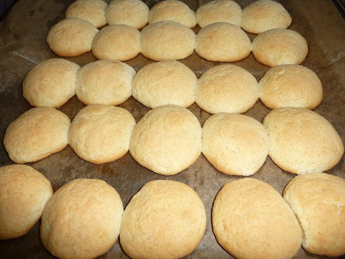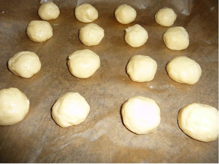 Руки смазать растительным маслом. Брать небольшое кол-во теста, скатать в шарик. Выкладывать на противень, застеленный пекарской бумагой на небольшом расстоянии друг от друга. При выпечки тесто увеличивается в объеме. У меня было 2 противня.